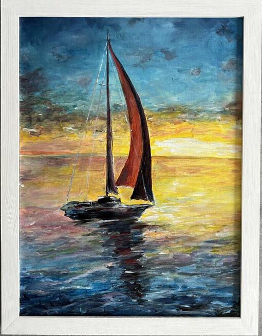 Sprzedam ładny obraz „Nad żaglami o zmierzchu”, przedstawiający żaglówkę na tle kolorowego zachodu słońca. ...